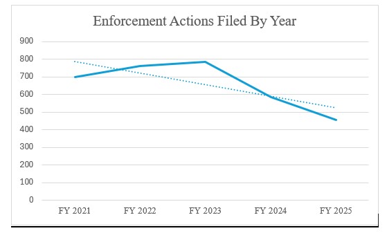 The year-over-year declines are steep across every category. The Commission filed just 456 total actions in fiscal 2025—down from a five-year high of 784 actions in fiscal 2023. Included in that total are 303 standalone actions—newly initiated cases charging securities law violations—which dropped 30 percent year-over-year. The agency brought 69 follow-on proceedings, which extend existing bars or suspensions, a drop of 26 percent. Broker-dealer actions collapsed from 140 in fiscal 2022 to 65 in 2025, of which 26 were follow-ons. That decline is partly explained by the SEC’s abandonment of off-channel communications cases that generated $2.3 billion in penalties from fiscal 2022 through early 2025, a program the current Commission has characterized as a misuse of enforcement resources.